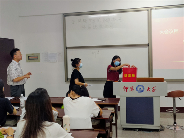 (会议现场图) 大会开始,全体党员共唱国歌,后由刘涛同志从体制机制、组织建设、党员发展、主题教育等方面回顾了过去一年里学生党支部的工作情况,总结了工作成绩、经验和不足,明确了新形势下学生党支部的新使命、新目标和新要求,提出了加强学生党支部工作,以高质量学生党建引领促进高质量发展的主要任务。随后,刘涛向全体党员介绍了党支部换届的程序。经过差额选举,刘涛同志、林曼婷同志、曹雪琪同志当选为新一届学生党支部委员会委员。