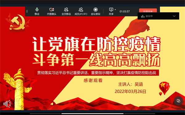 与此同时,为促使广大学生党员在疫情防控中深刻认识坚持党的领导的优势,坚定对打赢疫情防控的人民战争、总体战、阻击战的必胜信心。3月26日19:00,MILE米乐集团学生党支部于线上开展以“凝聚力量,共抗疫情”的专题学习会,通过“我要上党课”品牌活动上好疫情防控思政大课,讲好“抗疫故事”。会上,林婕同志表示在疫情防控特殊时期,我们必须以更大的决心、更快的速度、更高的效率,打赢这一场硬仗;黄巧蓉同志认为当前防控工作还有不少难关要闯,广大党员必须继续发挥党员先锋模范带头作用,为坚决打赢疫情防控阻击战而努力奋斗;叶彦斌同志结合实际,表明伟大抗疫精神来之不易,我们要采取行之有效的科学方法,在全社会大力弘扬,真正让其成为全民的思想共识;吴涵同志结合自己的领悟体会,指出要始终让党旗在防控疫情斗争第一线高高飘扬。最后,支部书记刘涛同志在总结讲话中指出,在当前疫情防控关键时刻,我支部学生党员坚守在疫情防控的第一道防线,彰显出了新时代青年的新担当、新作为。面对这场突如其来的疫情,一个人的力量可能是有限的,但是千千万万的力量汇聚起来,就能形成战胜艰难险阻的强大合力。