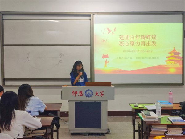 会议伊始,黄巧蓉同志从青春之我的视角出发,结合共青团的光辉历史,讲述了共青团作为党缔造和领导的青年群众组织,在革命、建设、改革发展不同历史时期接续奋斗、建功立业的感人事迹。叶彦斌同志结合新时代中国青年的特点,对继续做好团青工作提出了自己的想法,为引导广大团员青年走进百年团史,追寻信仰之光,勇担青春使命拓展了思路。钟佳怡同志以建团100周年为契机,紧密围绕迎庆党的二十大,表示当代青年要勇担青春使命,用实际行动向建团百年献礼。