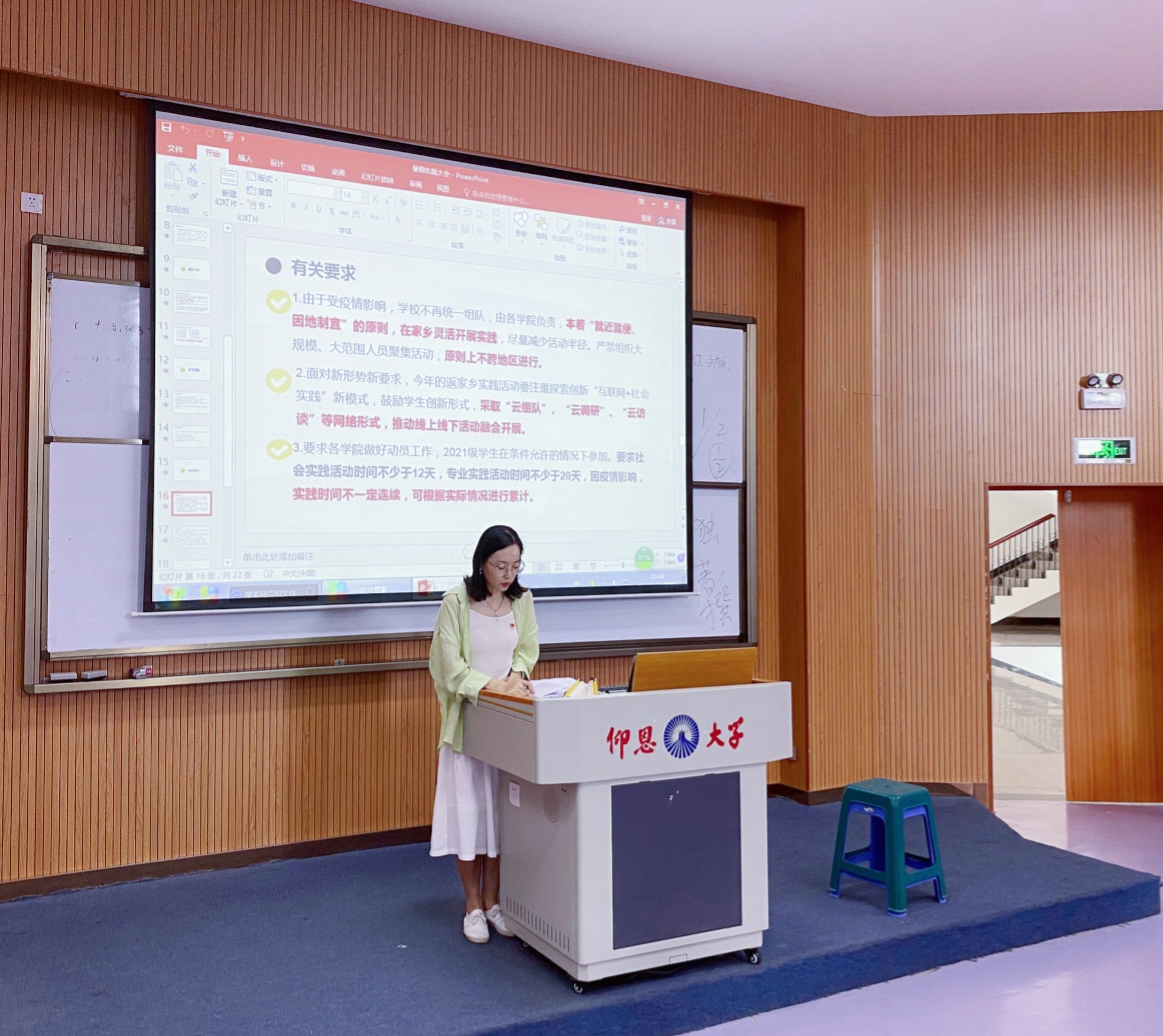 会上,吴珊珊老师紧扣“喜迎二十大,永远跟党走,奋进新征程”的主题,就暑期社会实践的开展要求及系列通知进行了详细解读,着重阐述了社会实践活动形式及专项实践活动,从实践时间、实践选题、实践总结等多个方面讲解了社会实践的具体流程,并在各阶段提出了所要注意的实践原则和相关要求。随后,曹流老师结合现下实际情况,对暑期社会实践具体内容进一步深入分析,重点讲述了实践宣传的注意事项,并特别强调对微博、微信公众号等互联网平台的运用,同时,她也积极回复现场同学的提问,给予宝贵建议,使同学们对暑期实践有了更深的了解。