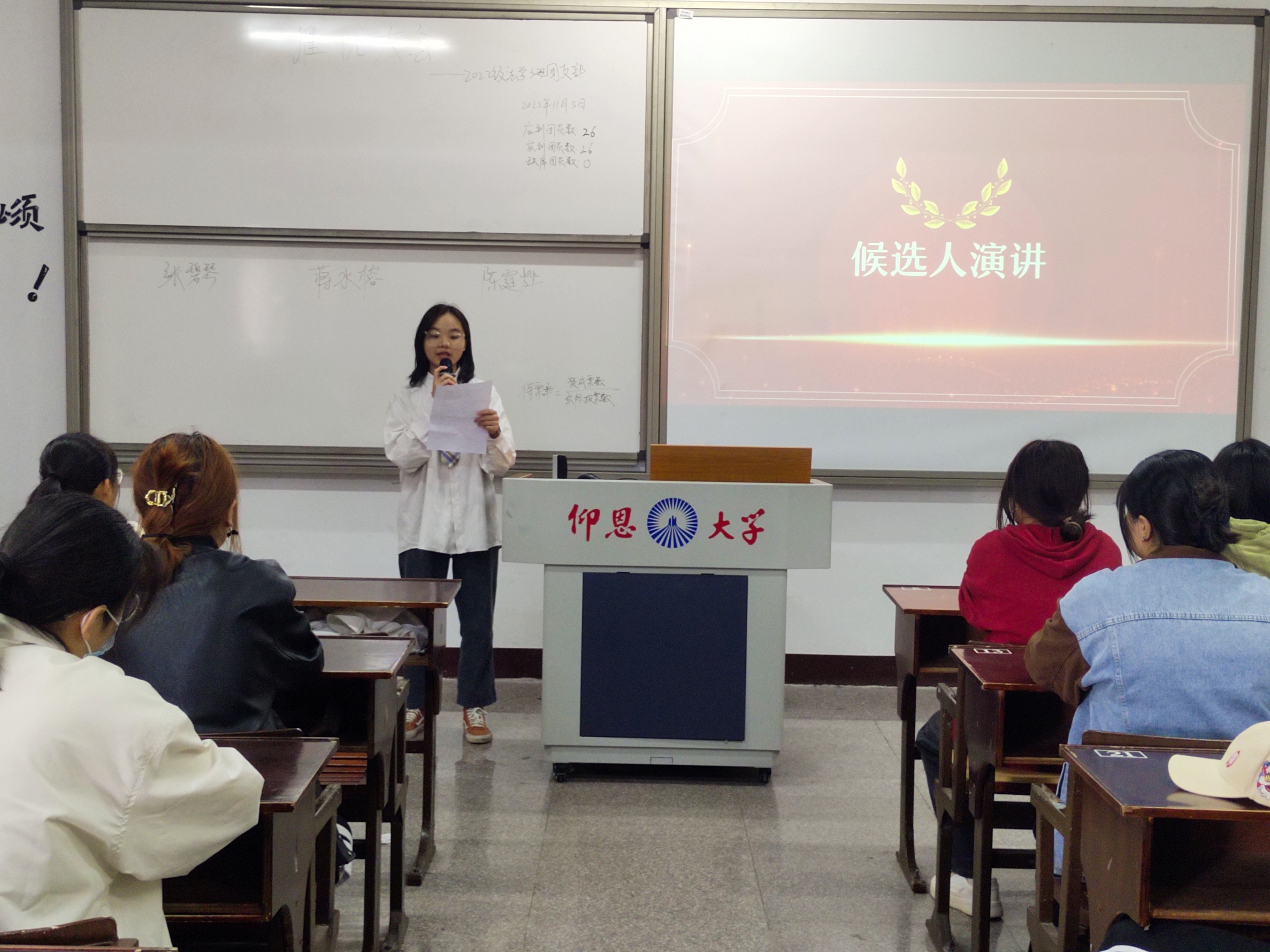 会议伊始,各班主持人上台主持,向支部团员介绍推优的流程规则,团支部概况以及公布报名的候选人名单。期间,各位候选人依次上台进行推优发言,表达了自己对党的个人见解以及申请入党的原因。演讲结束后,经过公正公开的现场投票、唱票等环节,四个班级的候选人得票率均达到百分之七十五以上,顺利成为MILE米乐集团入党积极分子的一员。最终,2022级新生有十一位同学成为了入党积极分子,相信他们会继续努力,不忘初心,砥砺前行。