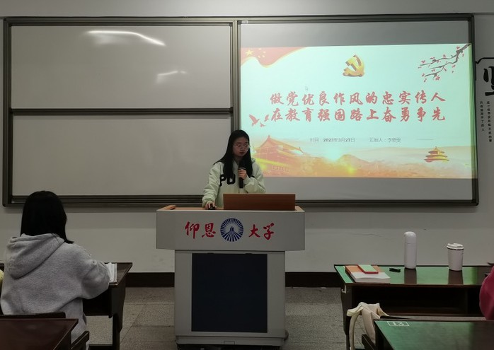 会上,曹晓丽同志根据习总书记强调的具体要求展开述说,强调要领会其精神内涵,内化于心,外化于行;廖超颖同志详细解释了党的优良作风应该是什么,指出在教育强国的道路上应当做什么;李晓雯同志着重阐述了传承党的优良作风以及建设教育强国的重要性,并且回答了“如何实现教育强国”的问题。