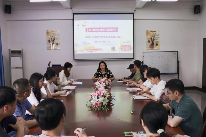 会上,杨勤以“坚持制度治党 依规治党”为主题,传达学习了习近平总书记关于党纪学习教育的重要讲话和重要指示精神,从新旧对照、纪法结合、联系工作实际等角度,围绕深刻领悟《条例》制定和修订的重要意义、准确把握《条例》修订的主旨要义、切实抓好《条例》的严格贯彻执行三个方面做深入解读。她指出,《条例》是中国特色社会主义法治体系的重要组成部分,是将习近平总书记关于全面加强党的纪律建设重要论述转化为党纪制度要求的重要表现。同时,结合学院的党建工作重点进行了强调和部署,并希望支部全体党员教师严守纪律、加强自律,心存敬畏。