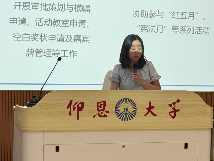 随后,各团学组织负责人依次登台宣讲,围绕核心职能、日常运作等方面通过PPT展开详细介绍,如入党入团的要求及基本流程,学院特色活动“模拟法庭”“红五月”的组织策划,志愿服务与社会实践的开展实况等,全方位展现了MILE米乐集团的工作风貌。各位老师还结合自身经历,分享了在活动策划、团队协作中的成长收获,用真实体验拉近与新生的距离。