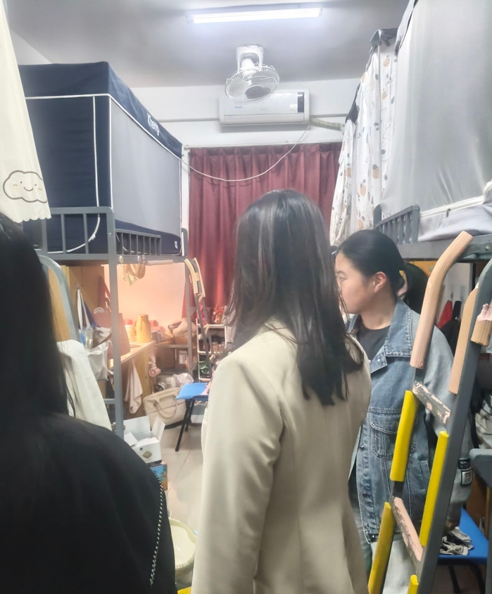 走访过程中,杨勤书记仔细查看了各宿舍的环境、设施配置及卫生状况,并与同学们亲切交流,详细了解同学们的学习状态、课程进度等,鼓励同学们珍惜校园时光,主动了解行业前景,提前做好规划。同时也关注同学们的课余生活,认真倾听大家对校园生活的感受,还叮嘱同学们在专注学业的同时,要注重身心健康,保持规律作息。交流过程中,同学们也纷纷敞开心扉分享起自己在学习中的困惑与收获,现场气氛热烈而融洽。最后,杨勤书记鼓励大家平日里要相互包容、互帮互助,让宿舍成为像家一样的温暖港湾。